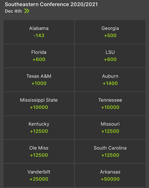 If you prefer Alabama's odds of returning back to the top of the SEC in 2020, this is the market you should invest in. As opposed to laying -200 in either of the aforementioned markets, the -143 requested here is more tolerable to a manageable betting bankroll.